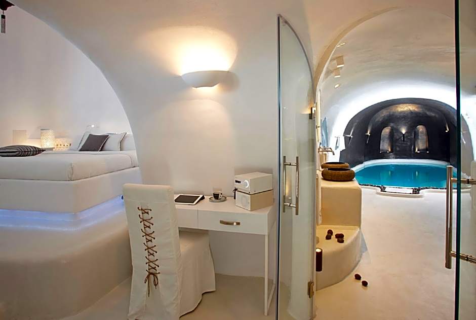 CAVE POOL SUITE is 269 square feet and includes a queen-size bed 150-154 width plus balcony, terrace, satellite tv , cable tv, hairdryer, tea and coffee making facilities , safe, bathrobes, and slippers.