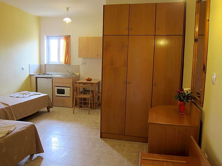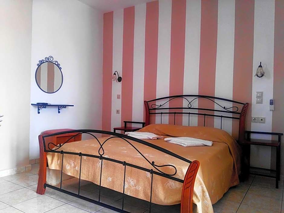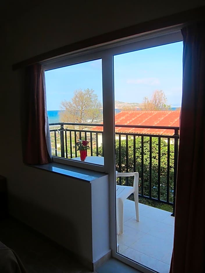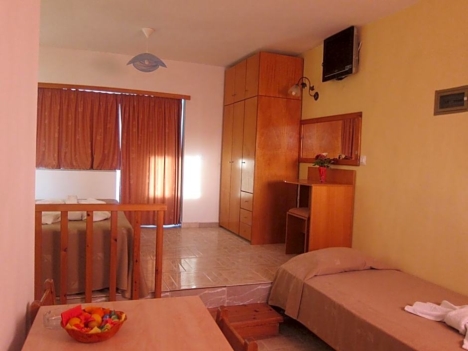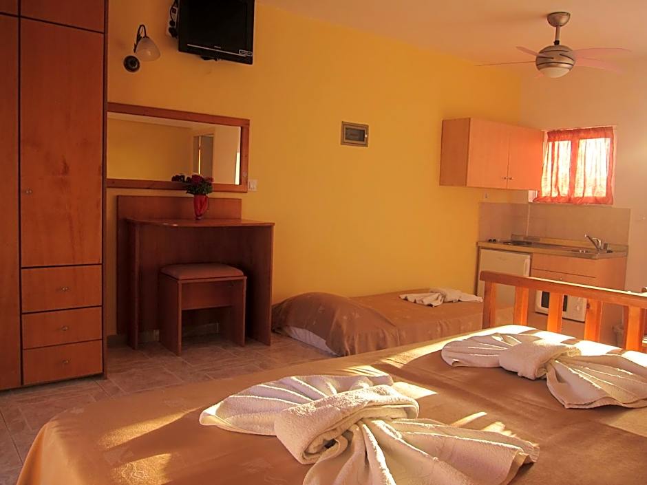 Maria and Costas (and the two generations of their family on either side) were so wonderful and welcoming, we couldn't have been made to feel more at home. They are such generous and lovely proprietors, nothing feels like too much to ask, I was totally blown away. We ate our evening meal out a few times but only wanted to come back to the restaurant at Baladinos because the delicious food there is prepared with love, because it is basically their family kitchen too, and it felt like we were eating in their home. Don't expect to see a menu anywhere. Costas and Maria will give you a verbal run down of all the dishes they have freshly prepared that day and you can choose from vegetarian and meat options, slow cooked, oven cooked and grilled - they have salads, ice cream and a bar too. A great sign is that so many locals choose it as their spot for an evening drink and a meal, or a weekend hang out. The room was a simple set up and had plenty of space form my son and I to enjoy our stay. It was cleaned every day which was great. The kitchen is enough to prepare a simple meal from, so we made breakfasts and our own lunches, but ate the delicious breakfast in the restaurant whenever we felt like it too. Baladinos Apartments is literally ON the beach, it's idyllic, we spent every day hanging out there. We could borrow an umbrella for the beach, which was great - beware the wind - umbrellas not always practical. We would love to return if we can!