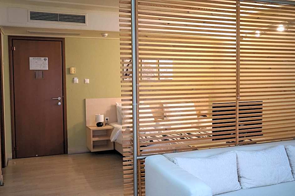 A large comfortable room for more people with air conditioning and heating, iron, hairdryer, TV and refrigerator.