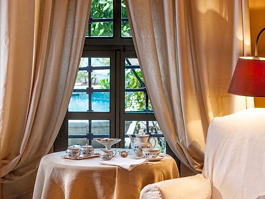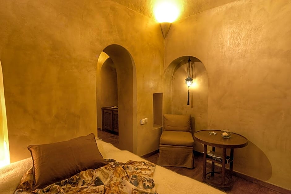 Spacious room located in the inner square or the triangular orange garden. The king size bed lies underneath the dome with the skylight. The bathroom, with a marble bathtub or shower with the forged bronze washbasin in the corner, matches perfectly the ochry of the walls. Please note that this room type cannot accommodate an extra bed.