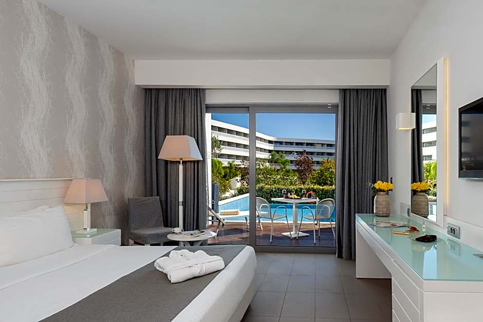 Modernly decorated room with a furnished balcony overlooking the pool. It includes: -air conditioning -safety box -mini-bar -satellite, flat-screen TV -free WiFi.