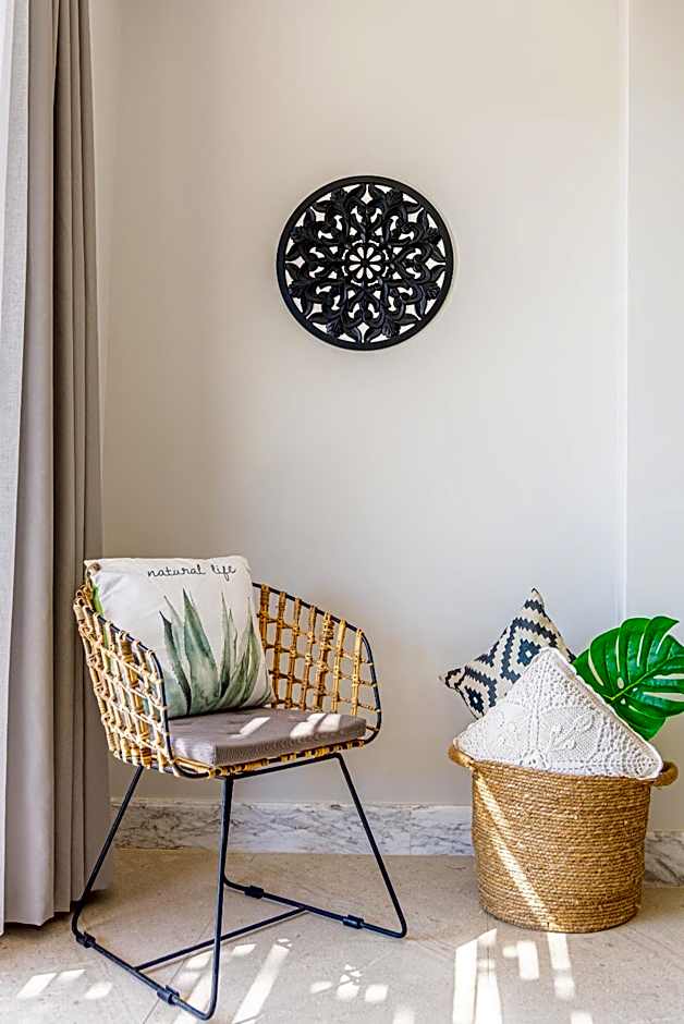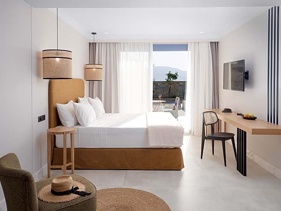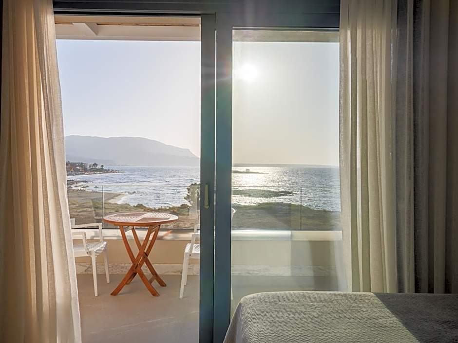 Pyrgos Blue sits right on the edge of Mália’s golden sands, offering direct beachfront access and two inviting outdoor pools—one with a scenic view and a separate kids-only pool. A sun deck, umbrellas, and loungers line the water’s edge, perfect for soaking up the sun, while a on-site hot tub and the option of massages for an extra charge add a touch of pampering after a day by the sea.