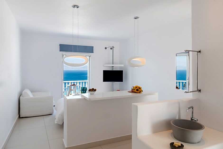 CYCLADES Suite Sea View with Private Pool & outdoor Jacuzzi is 269 square feet and includes a double bed 131-150 width plus balcony, terrace, extra beds on demand, desk, satellite tv , hairdryer, ironing set, safe, bathrobes, and slippers.