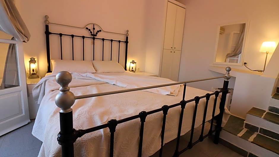 Opening to a shaded, furnished terrace with direct Aegean Sea view, this air-conditioned apartment features 2 bathrooms, a kitchenette with a microwave and fridge. Traditionally decorated in white tones with an iron bed and beamed ceilings, it offers: