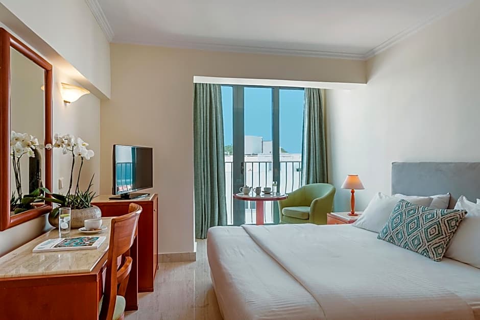 Opening to a balcony with side sea view, this air-conditioned room has a mini fridge, satellite TV, free WiFi, bathroom amenities, coffee & tea making facilities, hairdryer and private balcony. Pool towels are provided free of charge.