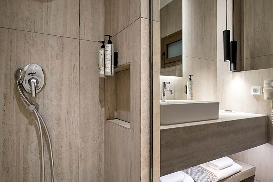 Overlooking the Aegean Sea from its furnished balcony or terrace, this modernly decorated room features a flat-screen satellite TV, a mini fridge and free Wi-Fi. The private bathroom is stocked with slippers and free toiletries.