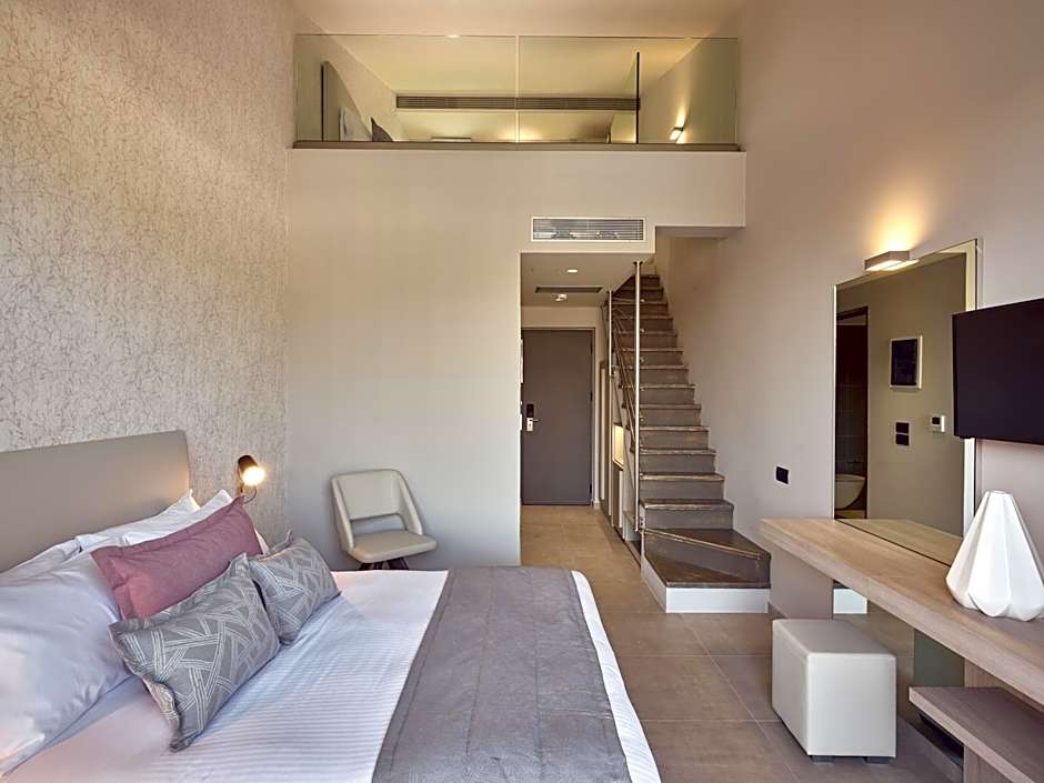 This spacious, air-conditioned room comes with modern decors with a sense of simplicity, and it consists of a master bedroom with a double bed on the low floor and 2 twin beds on the loft floor, with a bathroom with shower and a furnished balcony. A satellite flat screen TV of 32 inch, a mini fridge and a safe are also provided. The bathroom is stocked with a hairdryer and free toiletries.