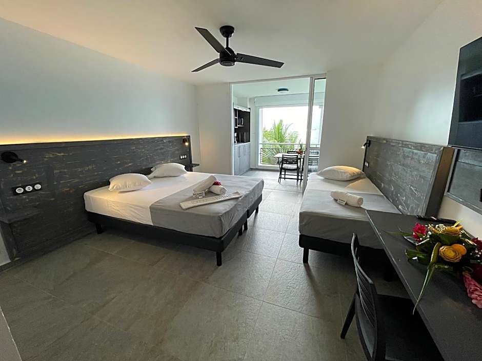 The Karaibes Hotel offers a variety of rooms including Quadruple, Twin, Superior Double, and Privilege Triple rooms. Smoking is not allowed in any of the rooms. The Quadruple room can accommodate 4 adults and 2 children and has 2 Twin beds and 1 Queen size bed. The Twin and Superior Double rooms can accommodate 2 adults and 1 child and have 2 Twin beds and 1 Queen size bed respectively. The Privilege Triple room can accommodate 3 adults and 1 child and has 1 Twin bed and 1 Double bed.