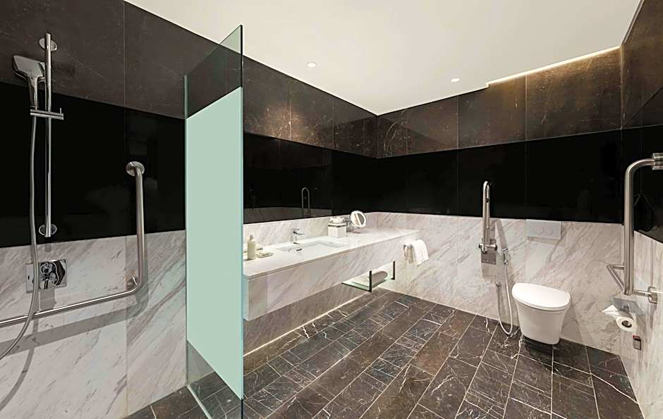The spacious air-conditioned suite provides a flat-screen TV with cable channels, a tea and coffee maker, executive lounge access, a seating area as well as city views. The unit offers 1 bed.