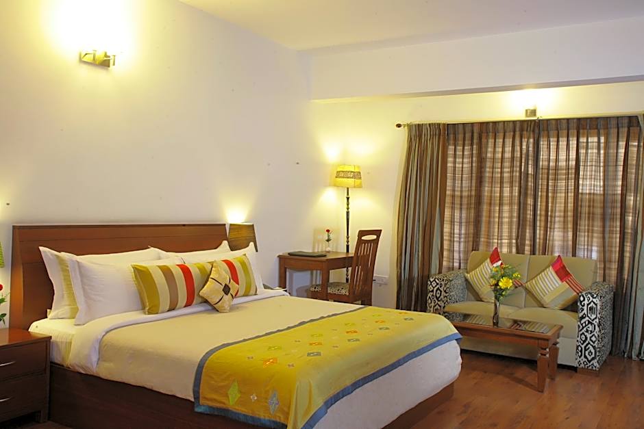 Room choices showcase variety: Deluxe Double Room spans 399 square feet and accommodates 2 adults and 1 child with a double bed; Deluxe, King covers 398 square feet for 2 adults and 1 child with a king bed; Premium, King sleeps up to 4 adults and 3 children with a king bed; Studio Deluxe fits 3 adults and 1 child; and a Suite accommodates up to 8 adults and 5 children. These configurations offer flexibility for solo travelers, couples, and larger groups visiting Bengaluru.