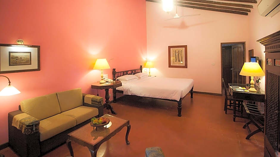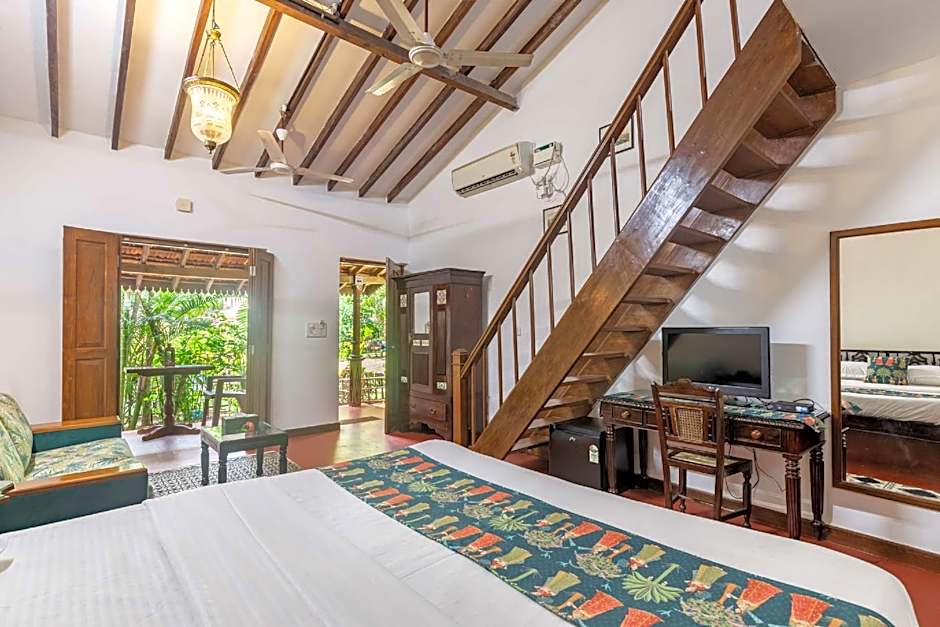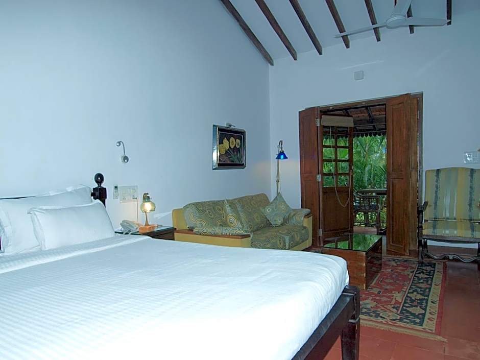 Outside, the leisure spaces invite plenty of unwind-time. An outdoor pool is available all season, with a separate kids’ pool for younger swimmers. Sun loungers and beach umbrellas dot the terrace, while a garden and private entrance add a touch of privacy. The bar, massage services, and a 24-hour front desk keep things convenient, and free live music/performances help capture Goa’s carefree spirit. Babysitting/child services and kids’ meals are available for an extra charge.