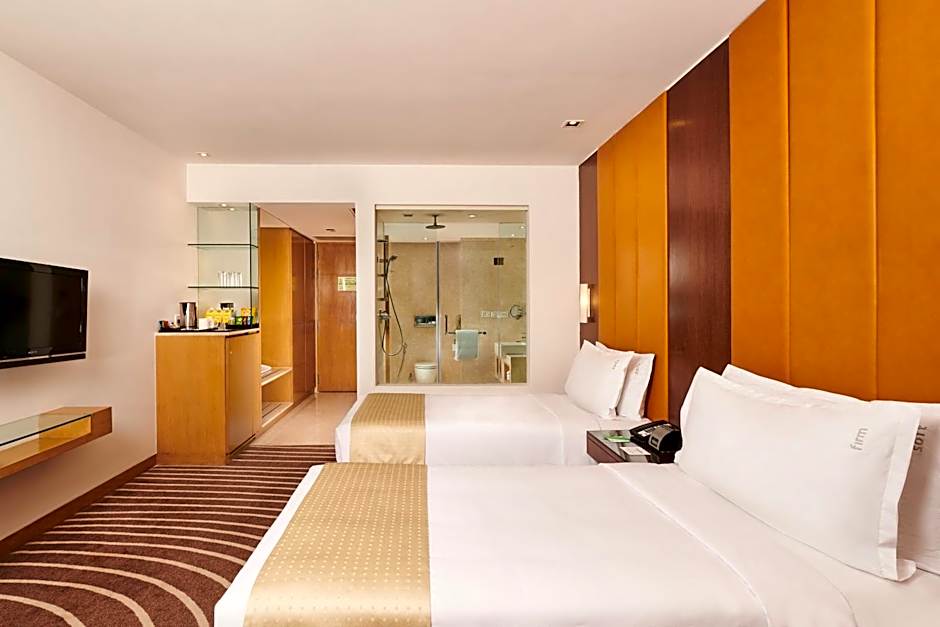 Modern air-conditioned room with an iPod dock, a flat-screen satellite TV and a private bathroom with a rain shower. Each room has a small sofa or seating area. Roll-away beds are available and it is chargeable. (See Policies). Outside food is not allowed inside the hotel premises.