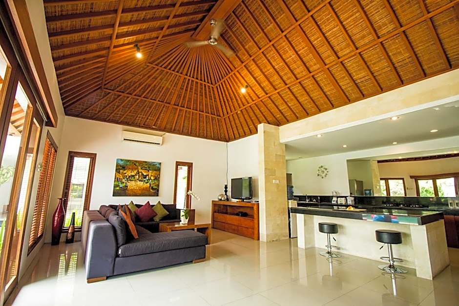 A modern, four-bedroom villa with a private pool. Features views of the rice fields and a semi-outdoor bathroom. A well-equipped kitchen with a stove is provided.