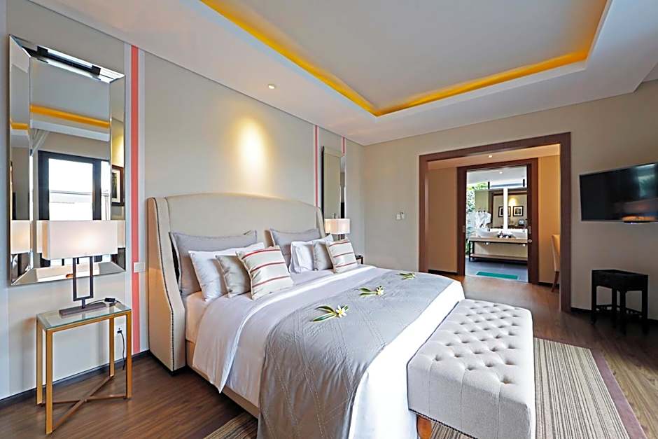 Offering more space, this two-bedroom villa has living and dining areas that open up to a private pool with sun chairs and a gazebo. Modern amenities include air conditioning and a flat-screen TV with satellite channels. The kitchenette comes with a refrigerator, a microwave, and an electric kettle. The semi open-plan bathroom features a shower and a free-standing bathtub. Extras include bathrobes, slippers, free toiletries.
