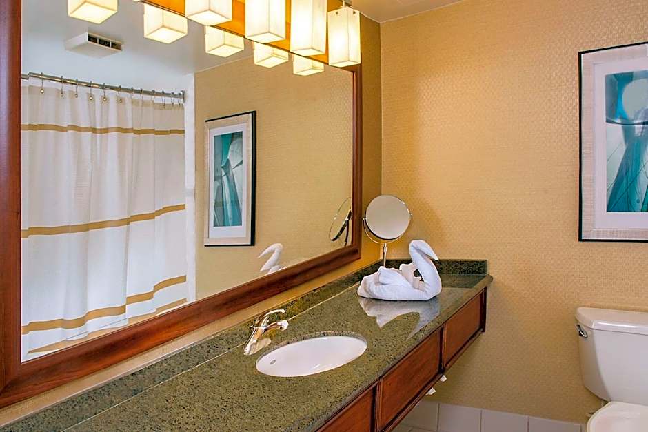 This spacious, air-conditioned room features a balcony with a view of the resort's pool. Each has a 43" LED Smart TV, a safety deposit box, and a fridge. The private marble bathroom includes a rain shower, slippers, and bathrobes.