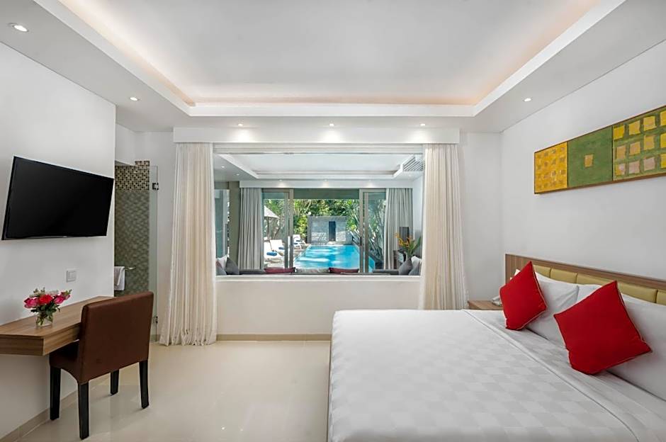 After a day of exploring Seminyak’s bustling streets or relaxing on the nearby beaches, unwind in the comfort of your private villa’s outdoor swimming pool. It’s a perfect spot to cool off while soaking up some sunshine, or to enjoy a lazy afternoon with a good book and a refreshing drink. The outdoor pool area, easily accessible to all guests, invites you to make a splash any time you like, adding a splash of fun to your tropical getaway.