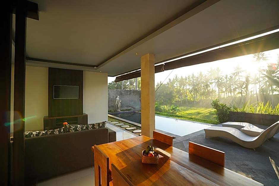 This spacious villa surrounded by garden and rice field view with private pool. It comes with modern amenities, private bathroom with bathtub.