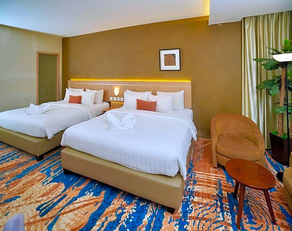The de Laxston Hotel Jogja by AZANA offers a variety of room types including Deluxe Double or Twin Room, Family Suite, Suite, Superior Double or Twin Room, and Executive Twin Room. All rooms are non-smoking, with bed options including Twin beds, King size beds, or a combination of both. The rooms accommodate 2 adults and 1 child, with room sizes ranging from 215 sqft to 398 sqft.