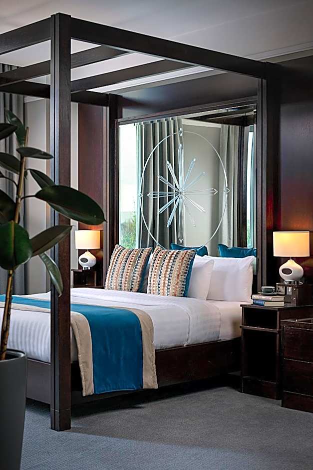 Decorated in a warm red and jade with a large floor to ceiling window, this room offers access to the Executive Lounge and library. The room also includes a king-size bed, a wall-mounted plasma TV, free Wi-Fi, and tea/coffee facilities.