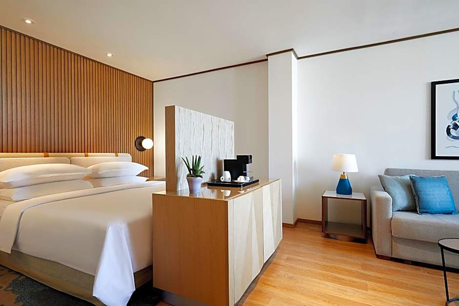The Sheraton Grand Tel Aviv offers a variety of rooms, including Deluxe Twin Rooms with Balcony - Seafront, Club Queen Rooms with Sea View - single occupancy, Deluxe Queen Rooms with Balcony and Sea View, Jaffa Suites, Marina Suites, Club Twin Rooms with Sea View - single occupancy, Mediterranean Suites, Junior King Suites with City View, and Deluxe Queen Rooms with Balcony - Seafront. These rooms range in size from 269 to 646 square feet and can accommodate up to 3 adults. None of the rooms allow smoking and the bed sizes vary between Twin beds, Queen size beds, and King size beds.