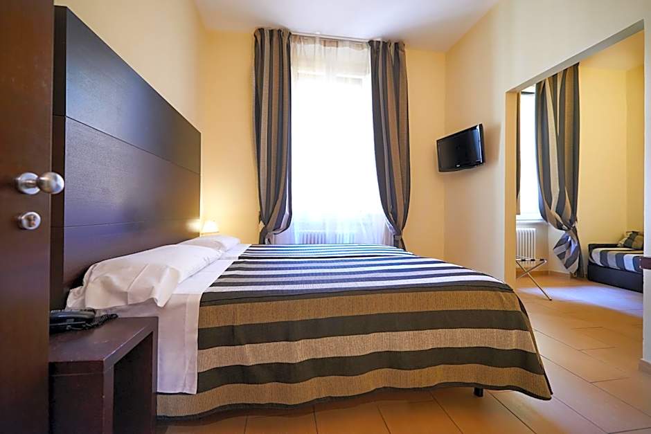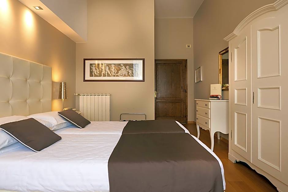 Hotel Cosimo de' Medici offers single rooms, double or twin rooms, and triple rooms. Smoking is not allowed in any of these rooms. Single rooms have a bed size of Twin and a room size of 118 sqft, accommodating one adult. Double or twin rooms have a bed size of 2 Twin beds or 1 Double bed, a room size of 183 sqft, and can accommodate two adults and one child. Triple rooms have a bed size of 1 Twin bed and 1 Double bed, a room size of 248 sqft, and can accommodate three adults.