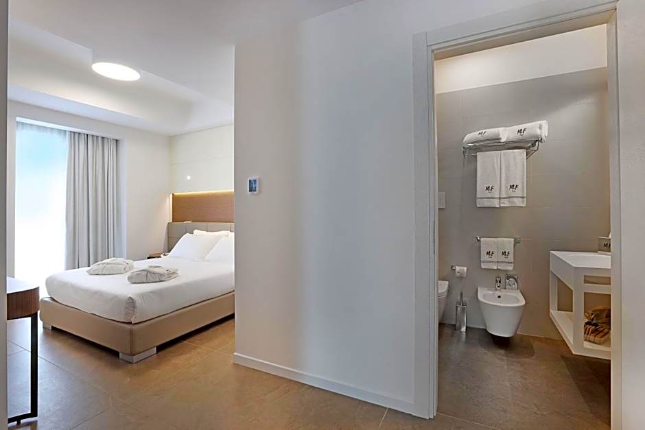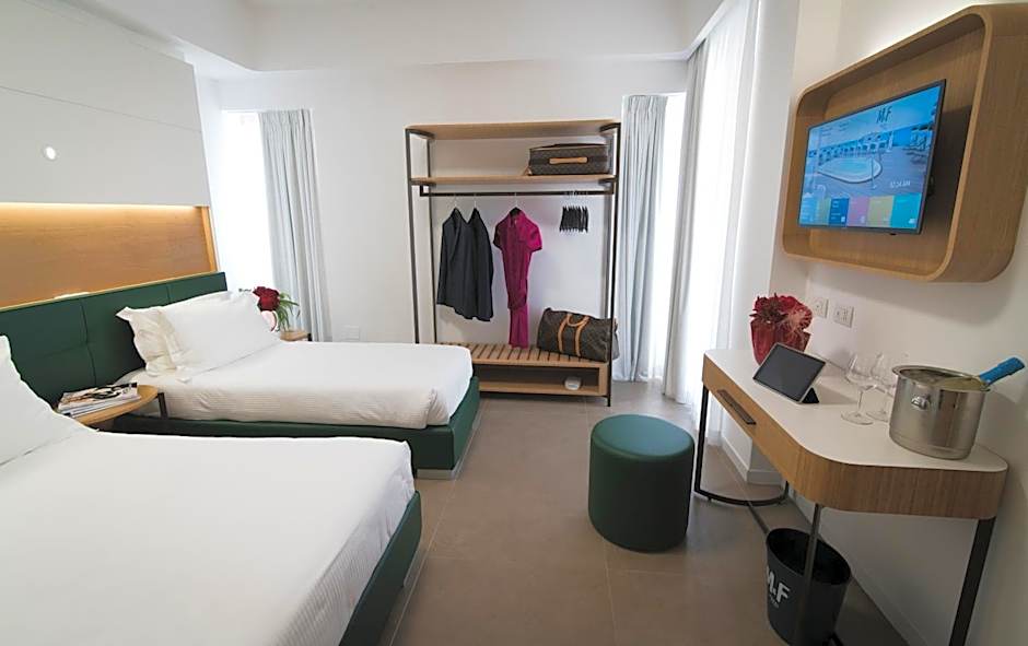 M&F Hotel offers a variety of rooms including Superior Double Room with Balcony, Junior Suite, Exclusive Double Room with Terrace, Suite, Economy Double Room with Balcony, and Standard Double Room. The occupancy ranges from single to four adults with options for children in some rooms. Smoking is not allowed in any of the rooms, and bed sizes vary from Queen to King size.