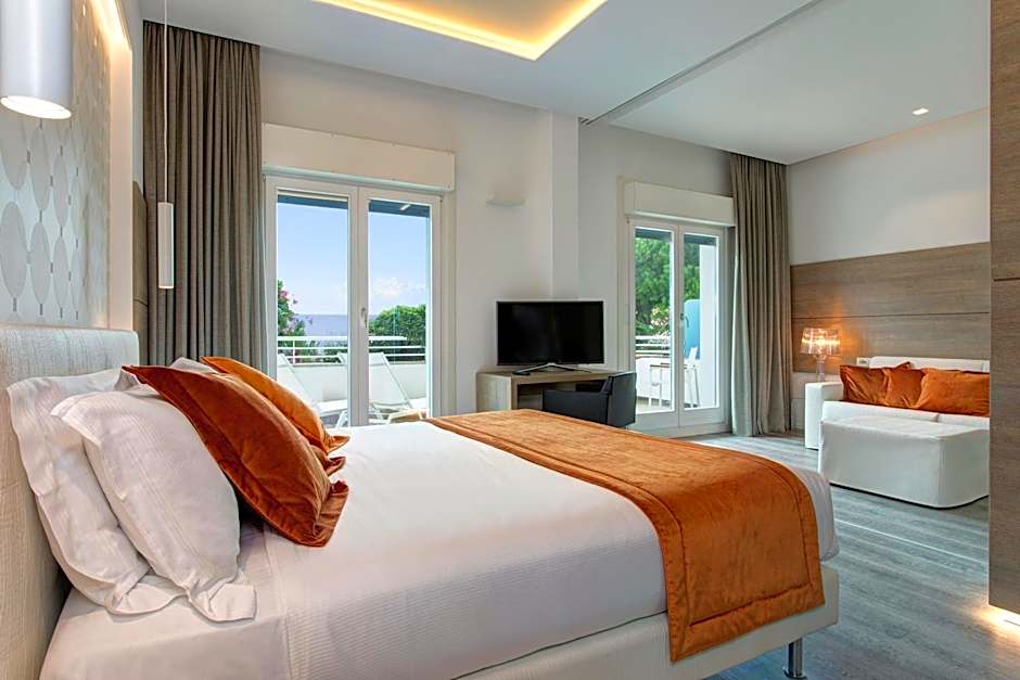 Offers a 98 ft² terrace with table and chairs. The bathroom features a window overlooking the Adriatic Sea. Includes access to the Finnish sauna, Turkish bath with chromotherapy function and relaxation area.