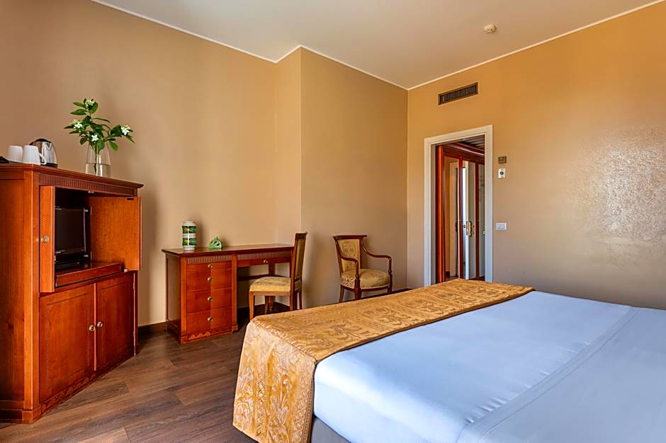 This larger double room features a satellite TV, mini-bar and air conditioning. It offers a view of mount Etna and a partial sea view.