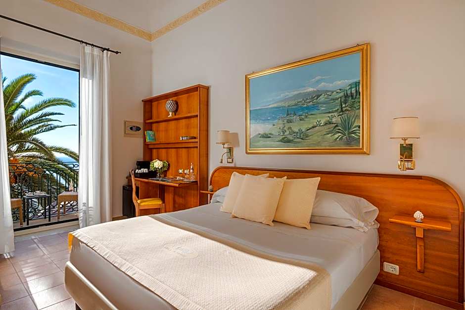 Spacious room on the elevated ground floor (floor 0), with high ceiling and terrace with view to Mt. Etna and with partial sea view. Individually controlled A/C, telephone, free Wi-Fi, USB charger, satellite smart-TV, refrigerator, tea & coffee making kit, and safe. Large bathroom with Jacuzzi tub-shower combination, hairdryer, magnifying mirror, and slippers.
