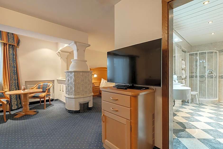 Traditional mountain-style room with light-wood furnishings and carpeted floors. It is spacious and has a flat-screen TV with satellite channels, a mountain-view balcony and free Wi-Fi.