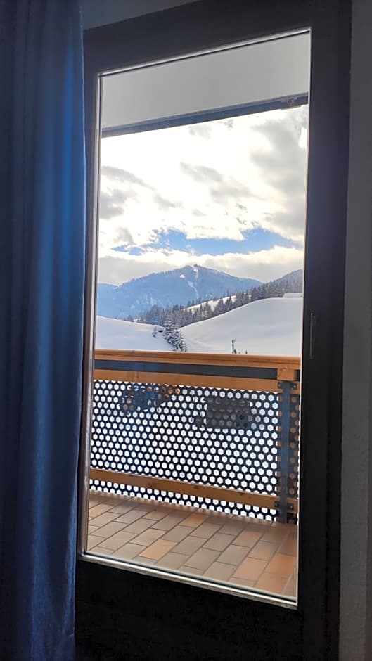 Larger room with Dolomite views, a Tyrolean wood-burning stove, and a LED TV with satellite. It includes a seating area, a mini-bar, and a private bathroom with free toiletries.