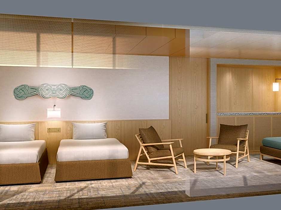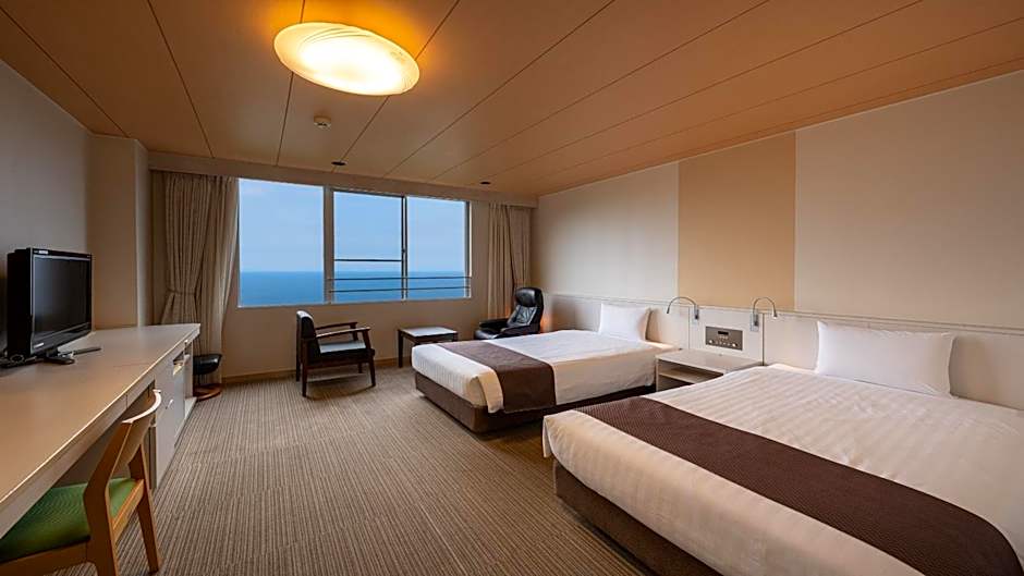 The quadruple room includes a private bathroom, well-fitted with a bath, a shower, a bidet, a hairdryer and slippers. The spacious air-conditioned quadruple room offers a flat-screen TV, tatami, a wardrobe, a safe deposit box as well as sea views. The unit has 2 beds and 2 futons.