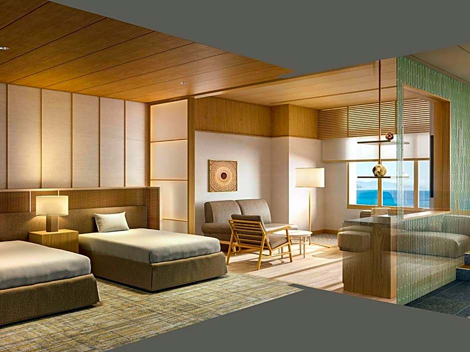 The family room includes a shared bathroom equipped with a bidet, a hairdryer and slippers. The air-conditioned family room provides a flat-screen TV, tatami, a wardrobe, a safe deposit box as well as sea views. The unit offers 5 futons.