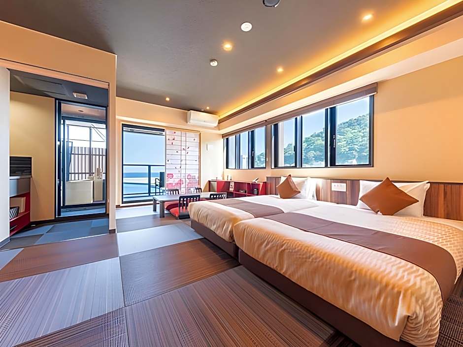 Guests will have a special experience as this twin room provides a private open-air bath. The spacious twin room offers air conditioning, a tea and coffee maker, a terrace with sea views as well as a private bathroom boasting a bath. The unit has 2 beds.