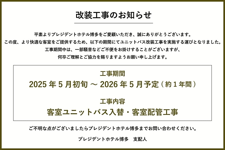 Guests at President Hotel Hakata can check in starting from 02:00 PM and need to check out by 11:00 AM.