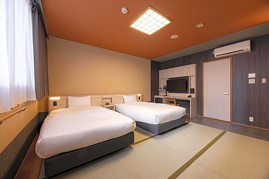 The twin room provides air conditioning, tatami, as well as a private bathroom featuring a bath and a shower. The twin room offers a flat-screen TV, an electric kettle, pajamas and heating. The unit offers 2 beds.