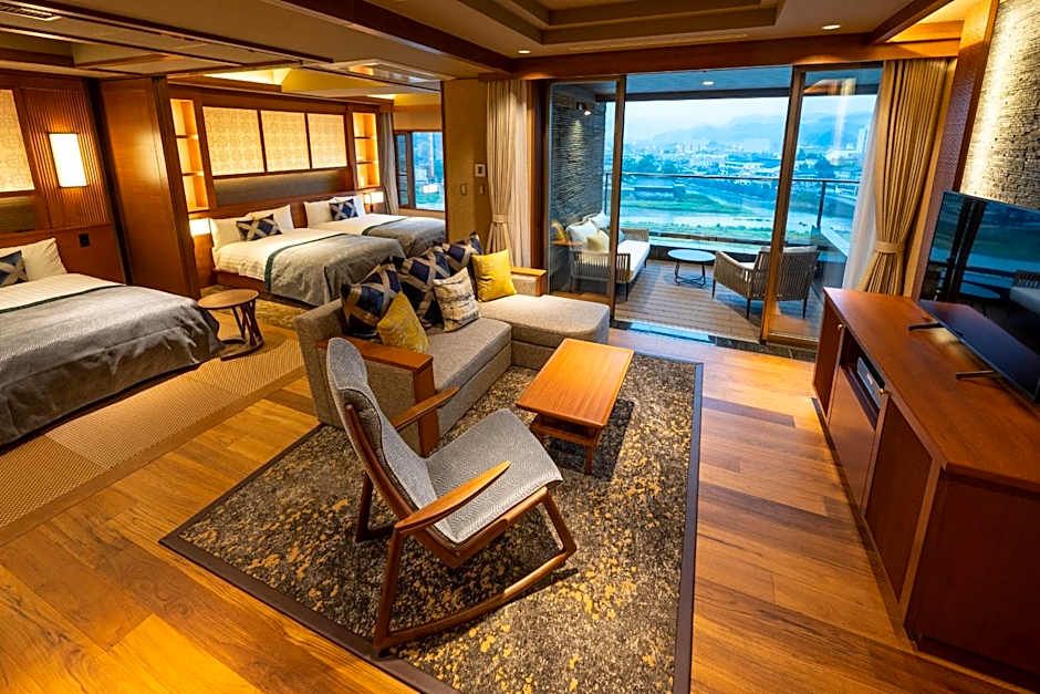 Guests will have a special experience as this family room features a private open-air bath. The spacious family room offers air conditioning, tatami, as well as a private bathroom boasting a bath and a shower. The family room provides a flat-screen TV, a wardrobe, a safe deposit box, an electric kettle as well as river views. The unit has 2 beds and 2 futons.