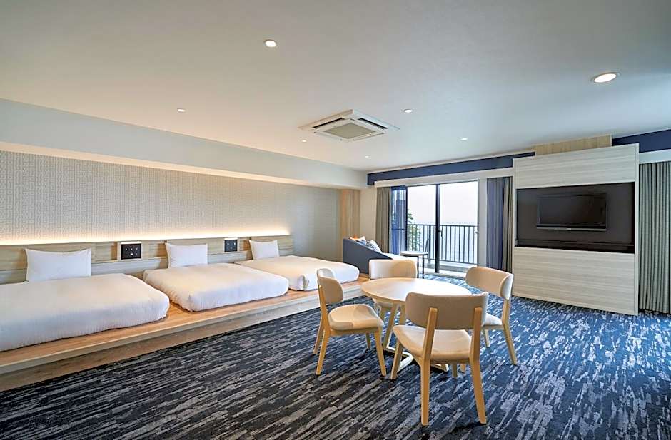 This triple room features a hot tub, private open-air bath and sauna. The spacious triple room features air conditioning, soundproof walls, a terrace with sea views as well as a private bathroom boasting a bath. The unit has 4 beds.