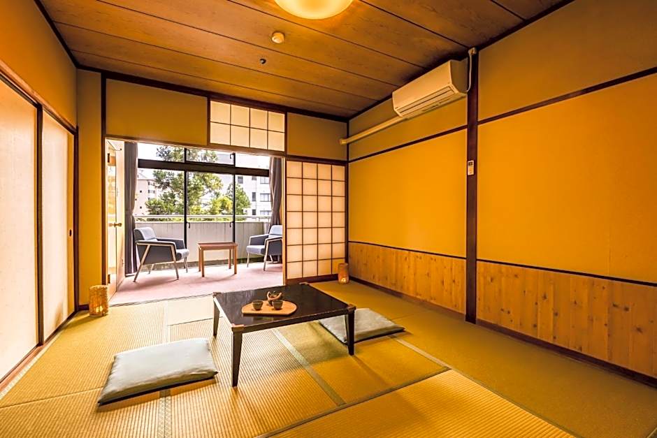 The spacious family room features air conditioning, tatami, as well as a private bathroom boasting a bath and a shower. The unit has 10 futons.