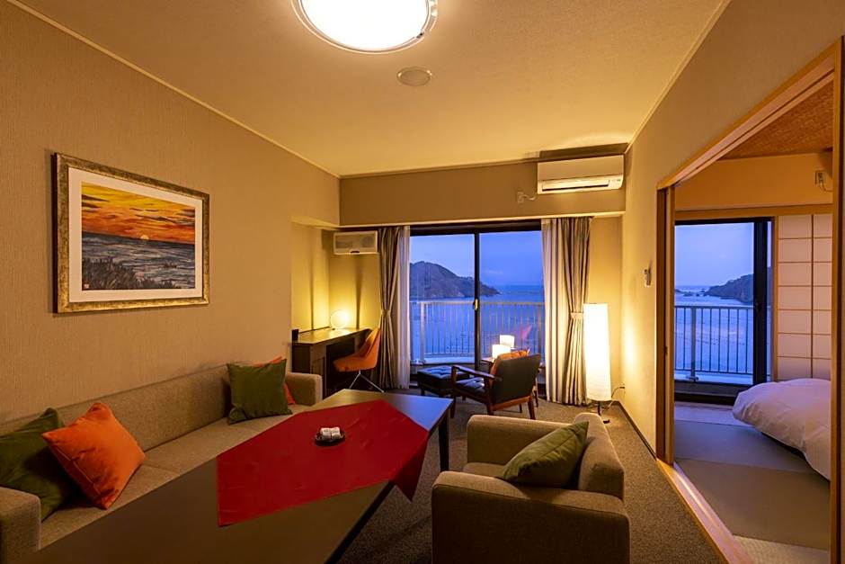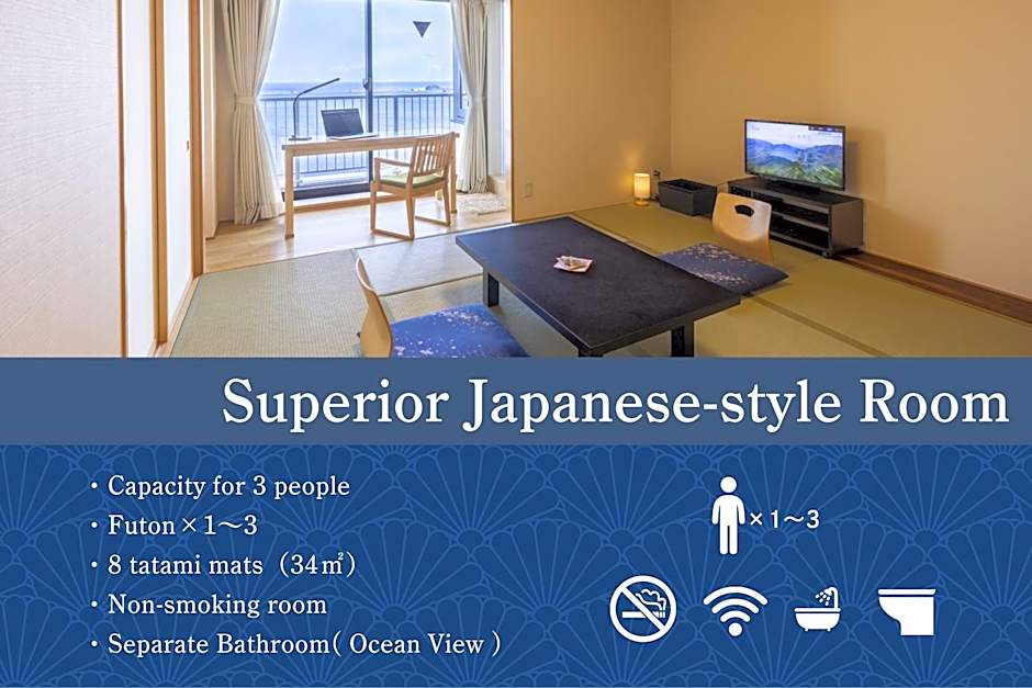 The triple room includes a private bathroom, well-fitted with a bath, a shower, a bidet, a hairdryer and slippers. The air-conditioned triple room provides a flat-screen TV, tatami, a seating area, a dining area as well as sea views. The unit offers 3 futons.