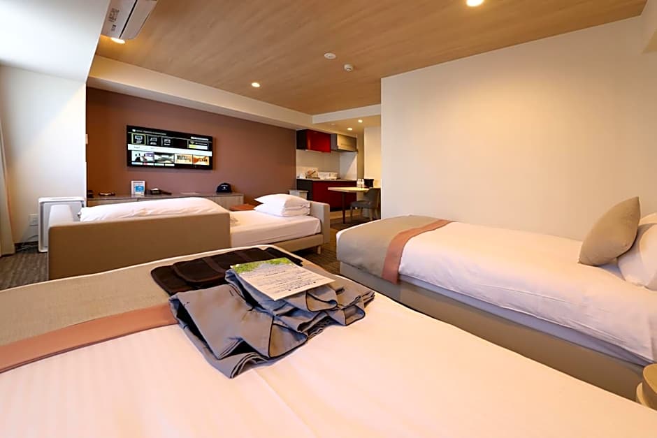 The spacious twin room provides air conditioning, a washing machine, as well as a private bathroom featuring a bath and a shower. The twin room features tatami floors, a seating area with a flat-screen TV, soundproof walls, a coffee machine, as well as a wardrobe. The unit offers 2 futons.