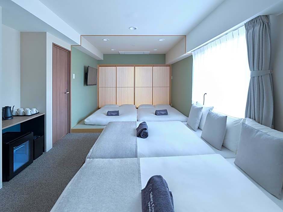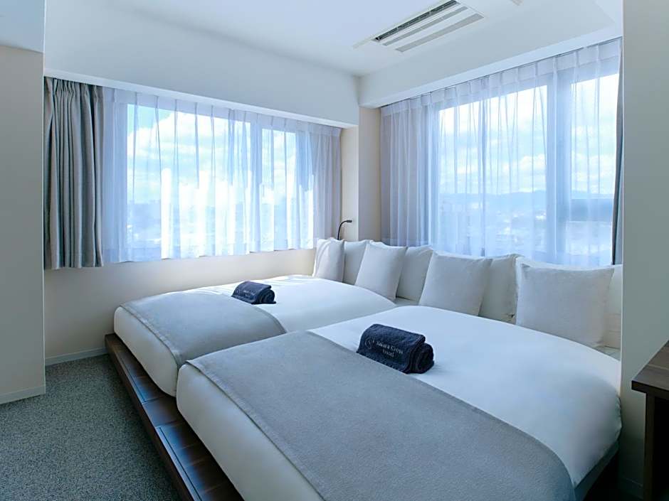 The Sakura Cross Hotel Kyoto Kiyomizu offers a variety of room types including Deluxe Twin Rooms, Family Suites, and Superior Twin Rooms. All rooms are non-smoking and have different sizes and bed configurations. The Deluxe Twin Room accommodates up to 4 adults with 2 double beds, the Family Suite accommodates up to 8 adults with 2 double beds and 2 futon mats, and the Superior Twin Room accommodates up to 4 adults with 2 double beds.