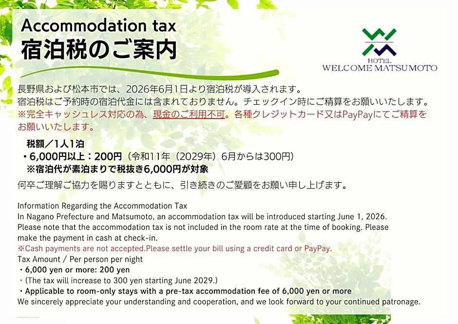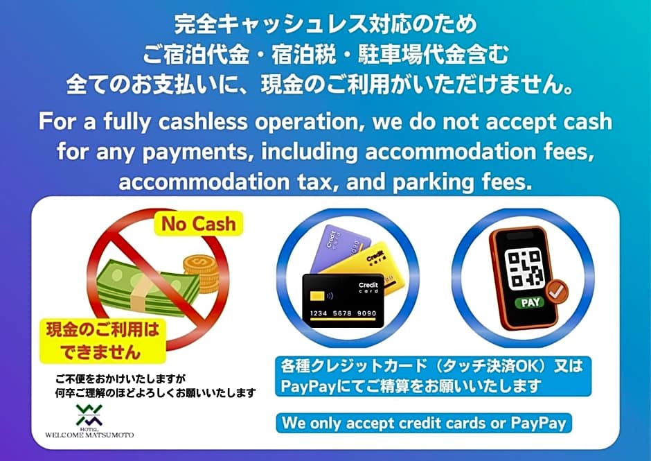 Does Hotel Welcome Matsumoto accept credit cards and cash payments?