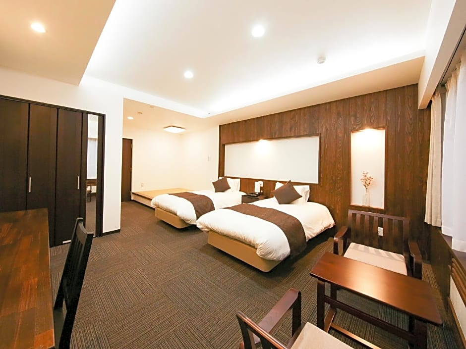 Features Western-style beds and a tatami (woven-straw) seating area. This room features Western beds on carpeted floors, a TV and a fridge. The private bathroom comes with a slippers and free toiletries.