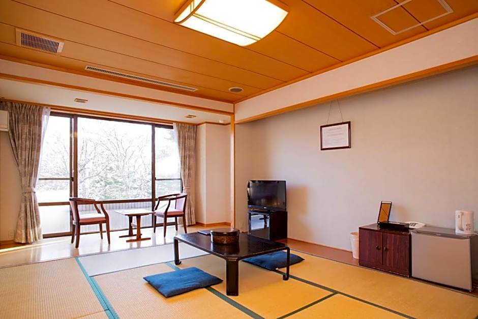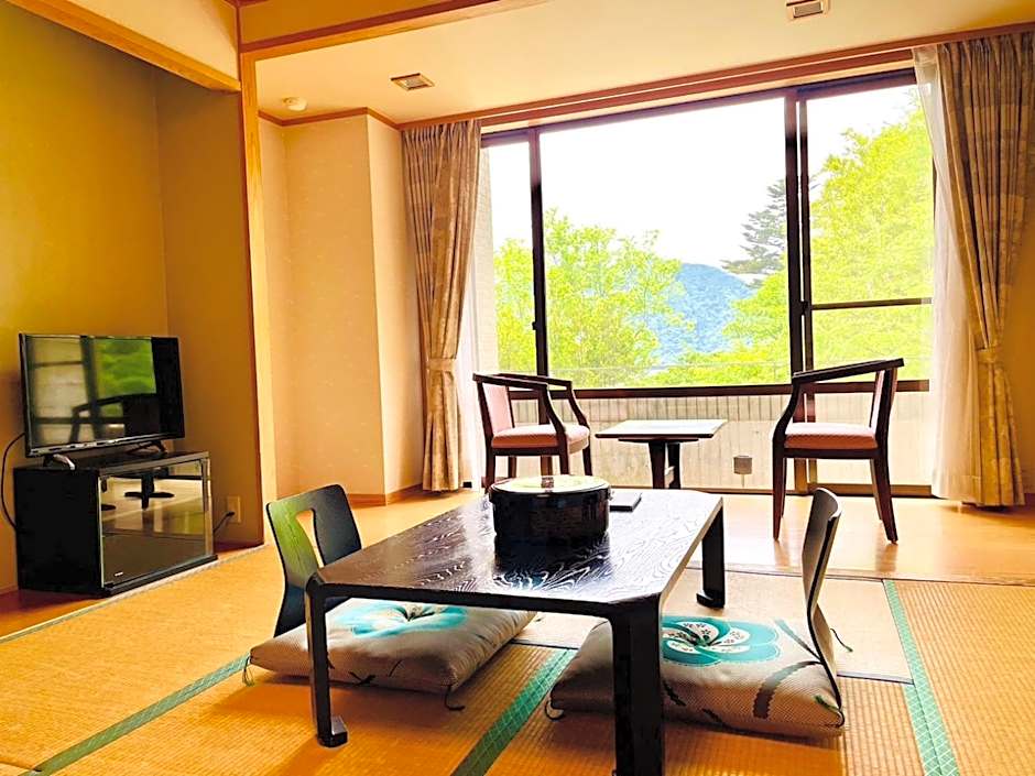The family room offers air conditioning, tatami, a balcony with lake views as well as a shared bathroom boasting a hairdryer. The unit has 5 futons.