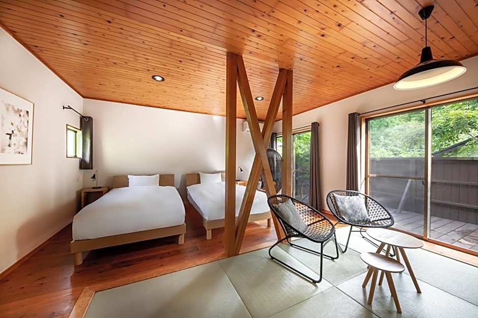 This twin room's special features are the hot tub and the private open-air bath. The spacious twin room offers air conditioning, a tea and coffee maker, a terrace with mountain views as well as a private bathroom featuring a bath. The unit offers 2 beds.