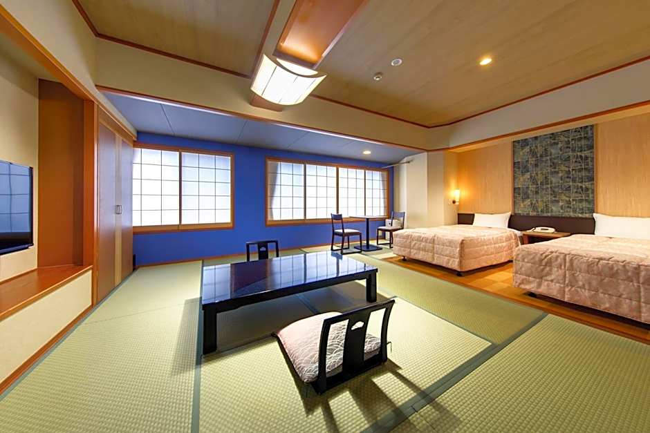 The spacious family room offers air conditioning, tatami, as well as a private bathroom boasting a bath and a shower. The unit has 2 beds and 3 futons.