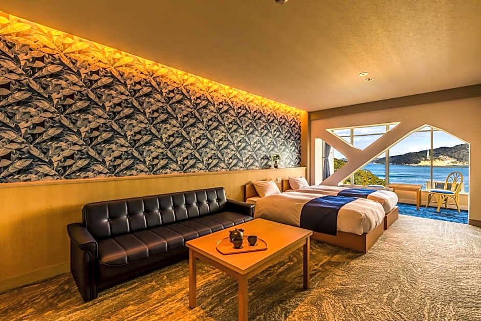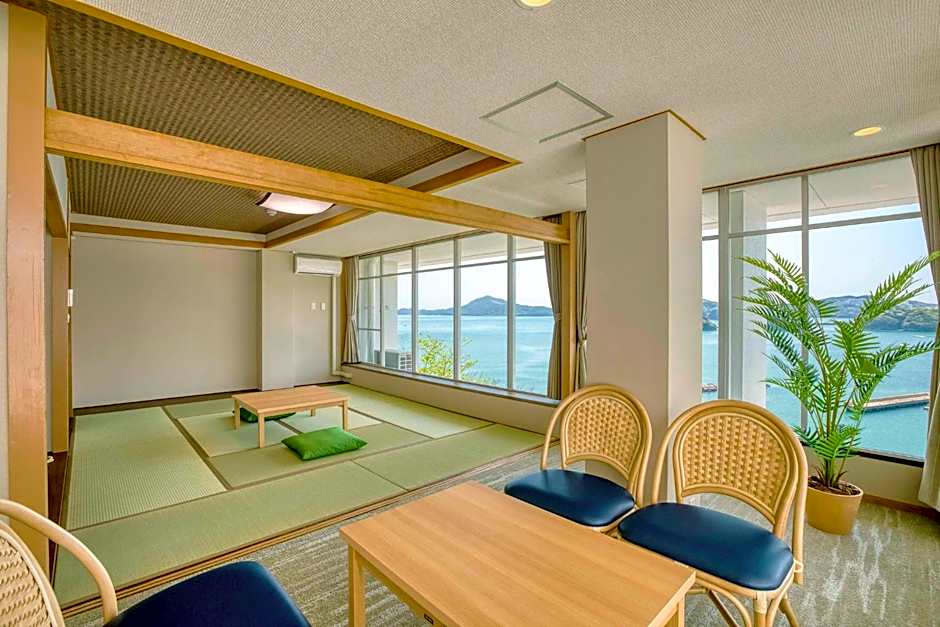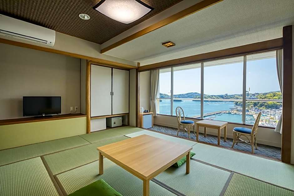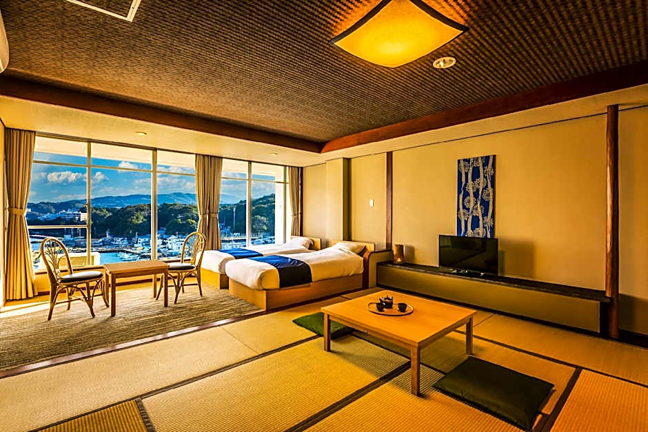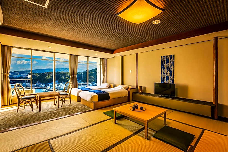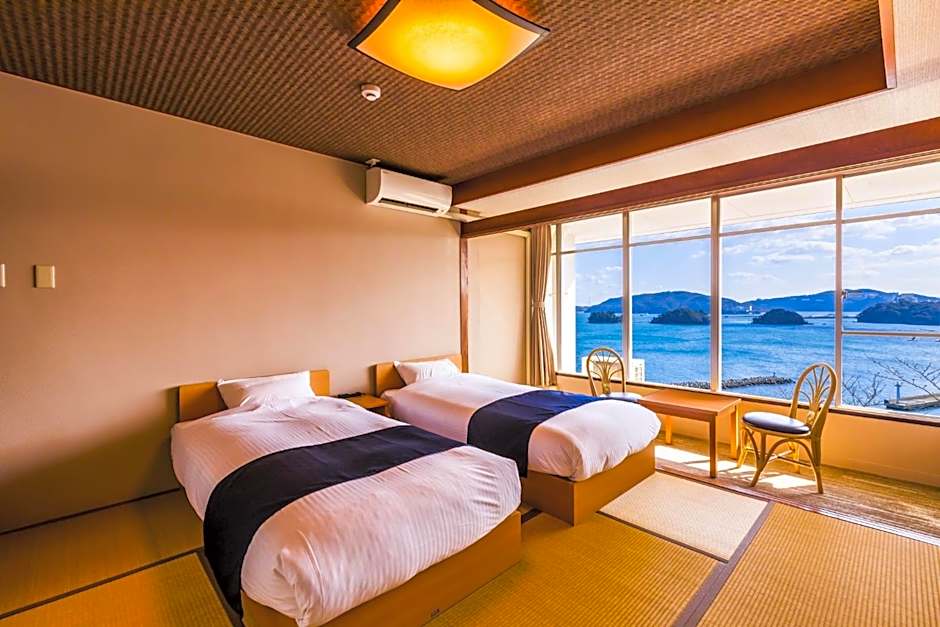 The twin room features heating, as well as a shared bathroom featuring slippers. The air-conditioned twin room provides a flat-screen TV, tatami, an electric kettle, yukata as well as sea views. The unit offers 2 beds.
