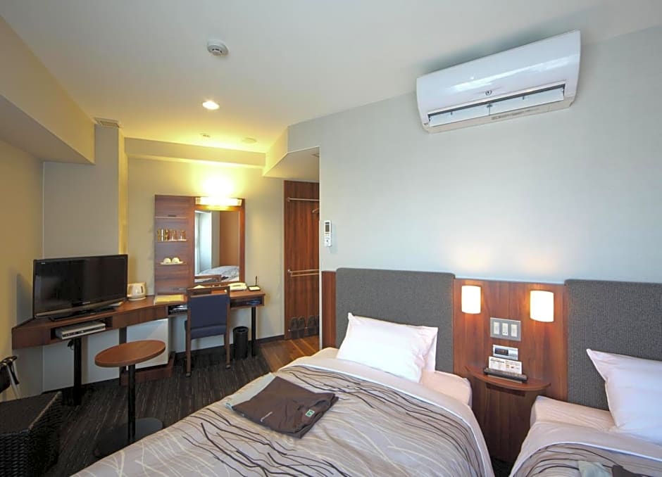 The Tsuruga Manten Hotel Ekimae offers Twin Rooms that accommodate 2 adults with 2 twin beds and a room size of 215 sqft. Single Rooms with a room size of 129 sqft are available for one adult with a twin bed. Double Rooms are also available with a room size of 129 sqft, accommodating 2 adults and 1 child with 1 double bed. Smoking is not allowed in any of these rooms.