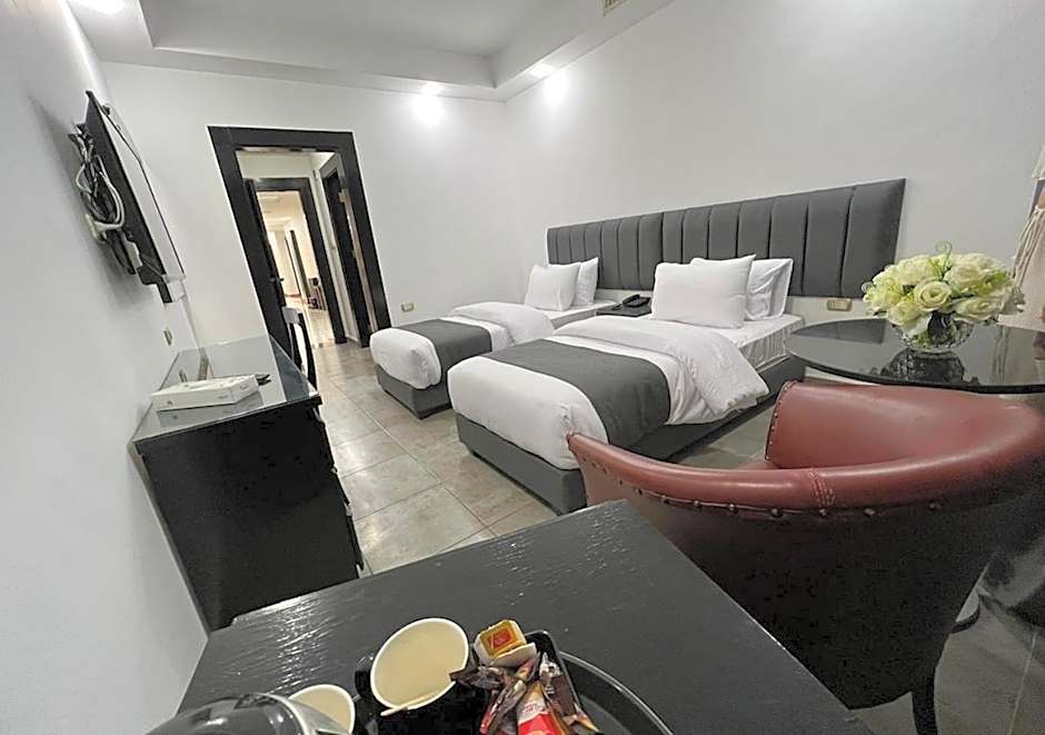 The Torino Hotel Amman offers a variety of room types including suites, triples, singles, twins, doubles, and family rooms. Smoking is not allowed in any of the rooms. The room sizes range from 269 sqft to 700 sqft. The accommodations vary depending on the room type, with options for 1 to 4 adults and 0 to 2 children. Bed sizes include twin, queen, and king.